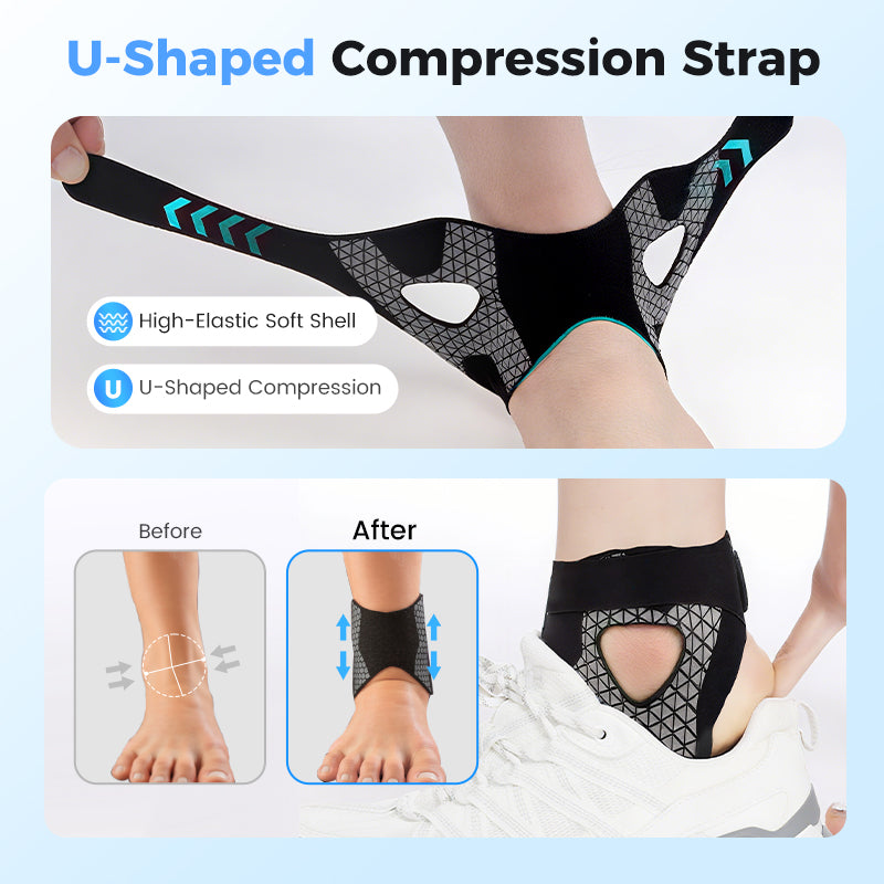 - U-formet kompresjonsbandasje: U-formede kompresjonsbandasjer øker blodsirkulasjonen og reduserer tretthet i føttene, samtidig som de gir ekstra stabilitet for ankelen.
